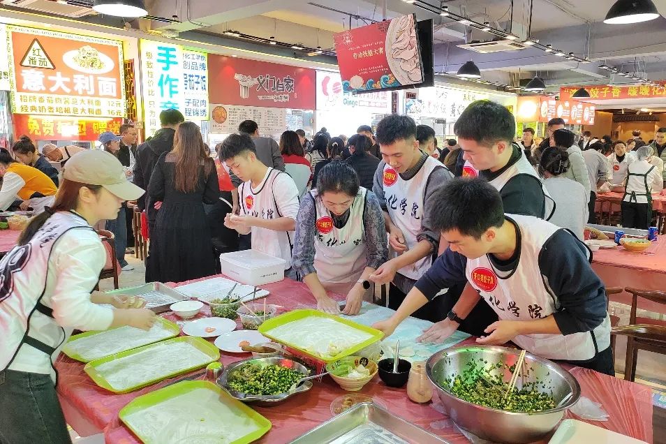 比赛当日,吉林化工学院第一学生食堂里欢声笑语。同学们秒变“超级厨师”,捣蒜、拌馅、擀皮、包饺子,分工协作,井然有序。在老师的帮助下,大家把温暖和快乐都包进了玲珑可爱的饺子里。