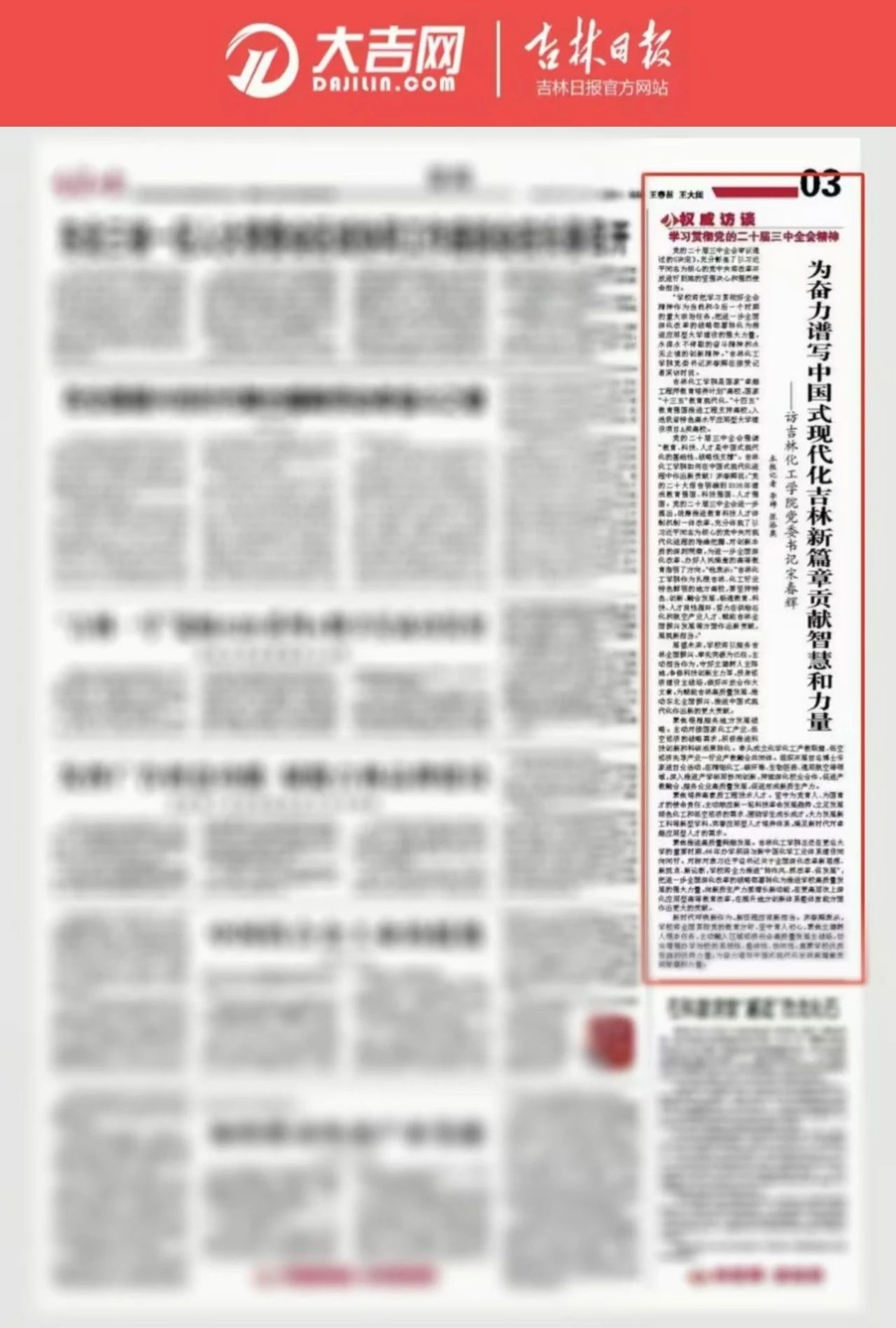 近日,学校党委书记宋春辉接受《吉林日报》专访,介绍了吉林化工学院学习贯彻党的二十届三中全会精神,着力转作风、抓改革、促发展,聚焦根植服务地方发展战略、聚焦培养高素质工程技术人才、聚焦推进高质量跨越发展,助力吉林全面振兴率先突破的思路与举措。9月21日《吉林日报》要闻版以“为奋力谱写中国式现代化吉林新篇章贡献智慧和力量——访吉林化工学院党委书记宋春辉”为题,进行了报道。