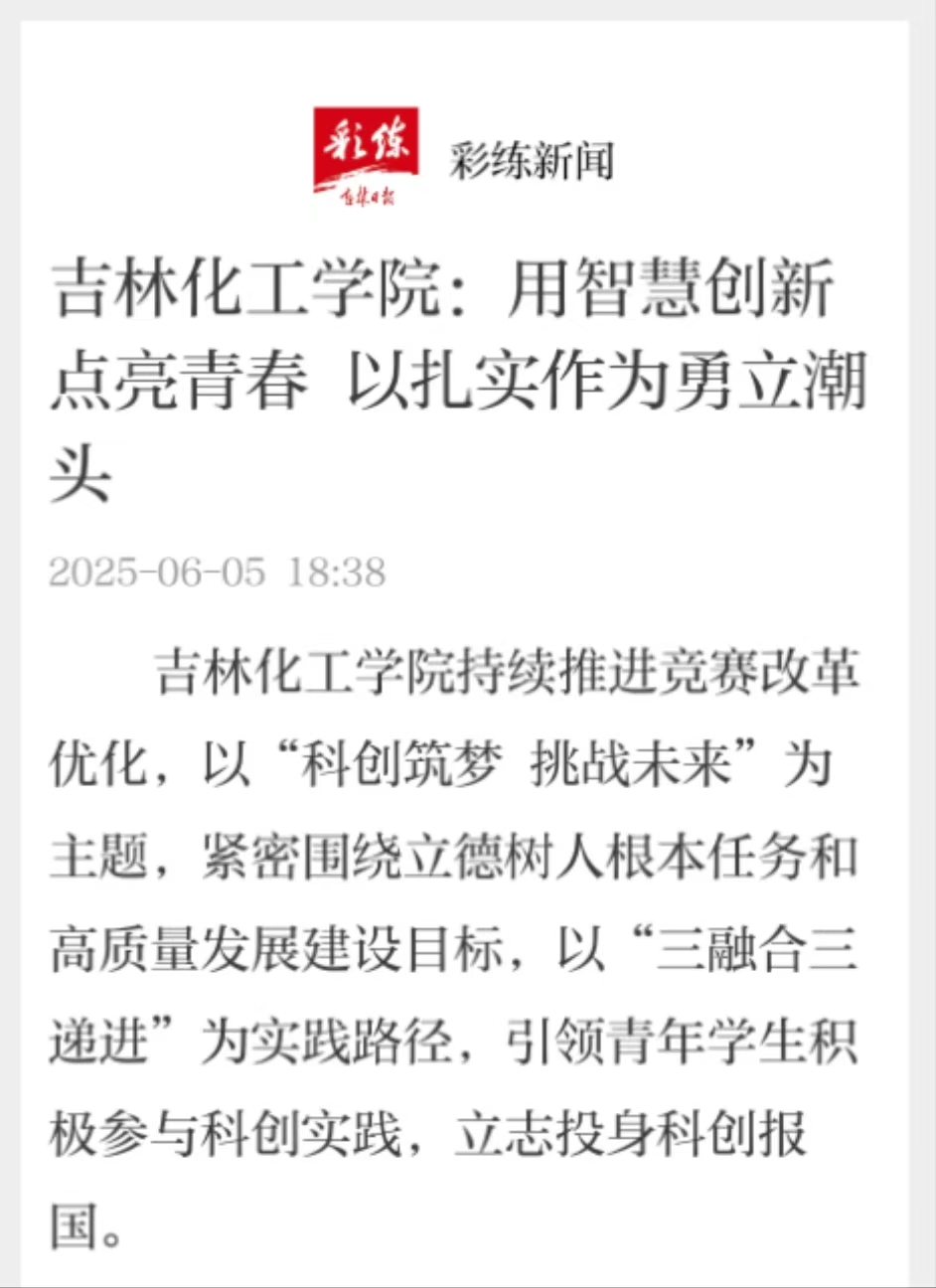 2025年6月5日《吉林日报》报道吉林化工学院持续推进竞赛改革优化,以“科创筑梦 挑战未来”为主题,紧密围绕立德树人根本任务和高质量发展建设目标,以“三融合三递进”为实践路径,引领青年学生积极参与科创实践,立志投身科创报国。