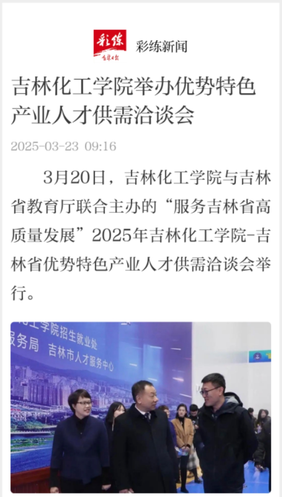 2025年3月20日《吉林日报》报道吉林化工学院与吉林省教育厅联合主办的“服务吉林省高质量发展”2025年吉林化工学院-吉林省优势特色产业人才供需洽谈会举行。