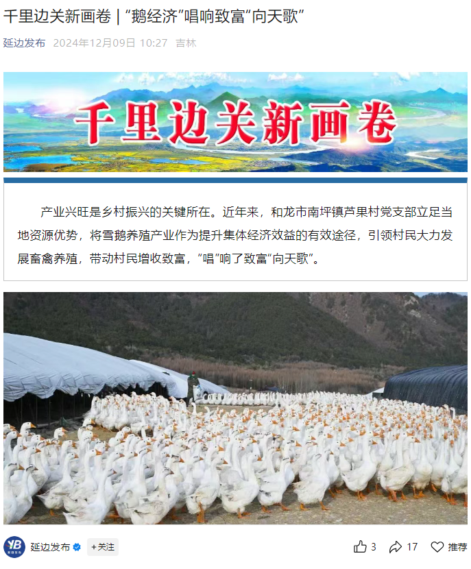 2024年12月9日《延边日报》报道产业兴旺是乡村振兴的关键所在。近年来,和龙市南坪镇芦果村党支部立足当地资源优势,将雪鹅养殖产业作为提升集体经济效益的有效途径,引领村民大力发展畜禽养殖,带动村民增收致富,“唱”响了致富“向天歌”。