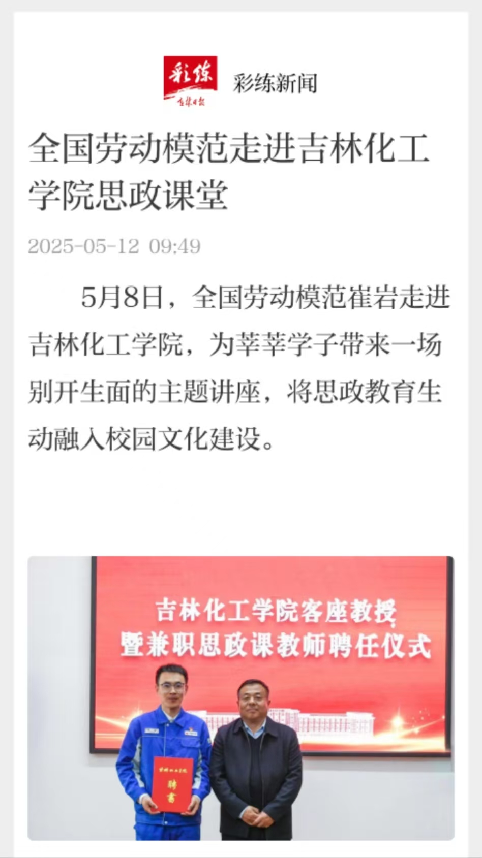 2025年5月8日《吉林日报》报道全国劳动模范崔岩走进吉林化工学院,为莘莘学子带来一场别开生面的主题讲座,将思政教育生动融入校园文化建设。